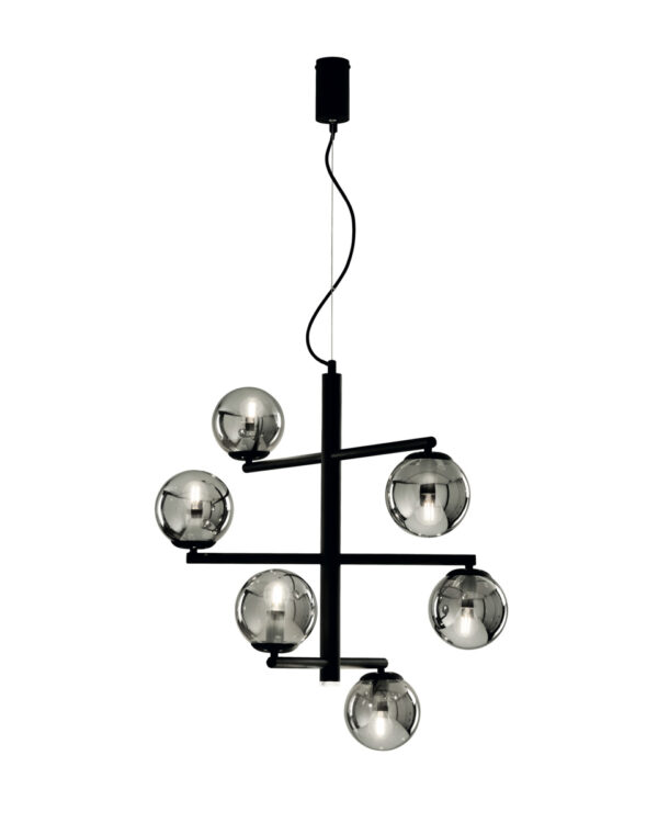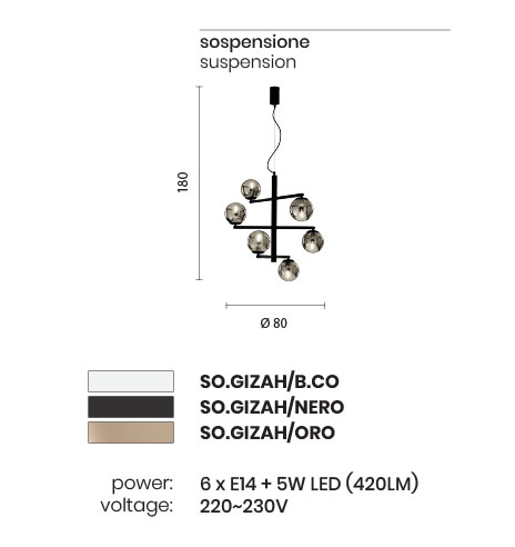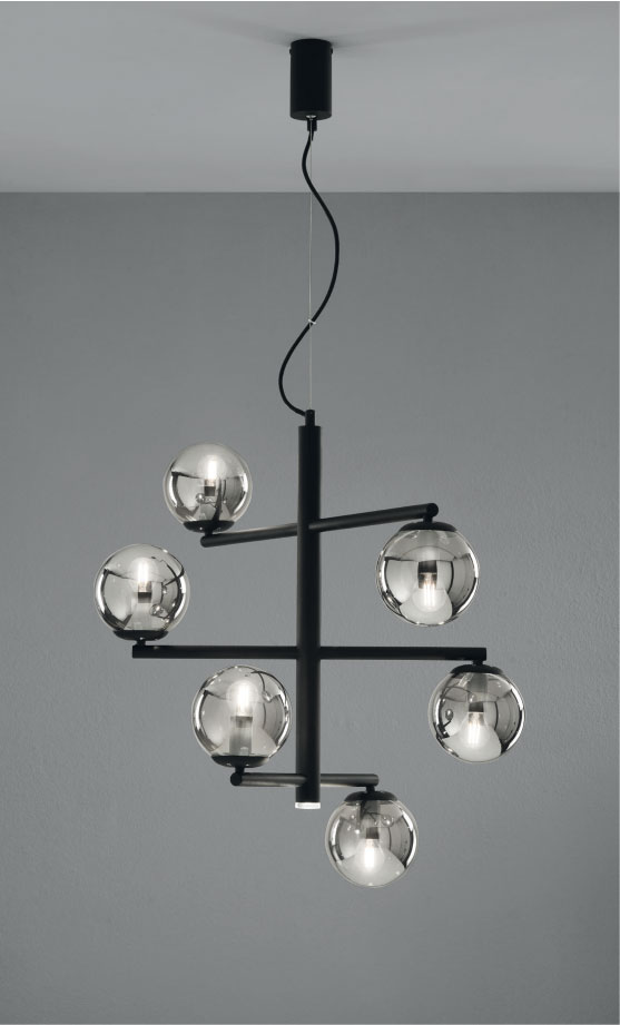 Sospensione con lampadine E14 con LED integrato. Struttura in metallo con diffusori in vetro soffiato. Cavetti regolabili in altezza. Disponibile in diverse varianti di colore.