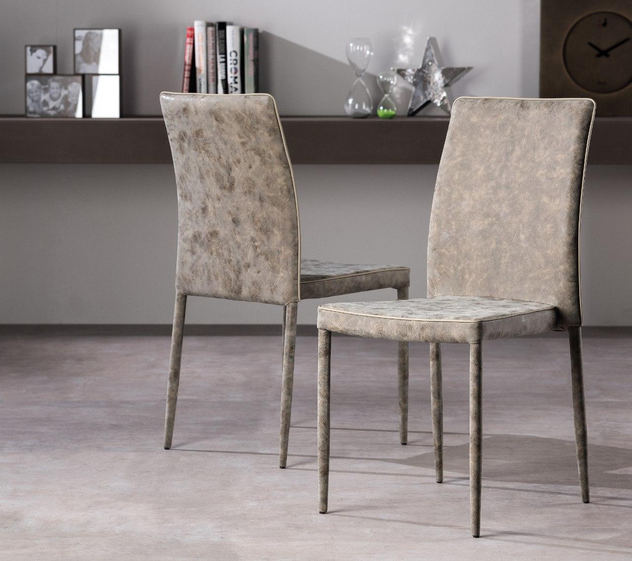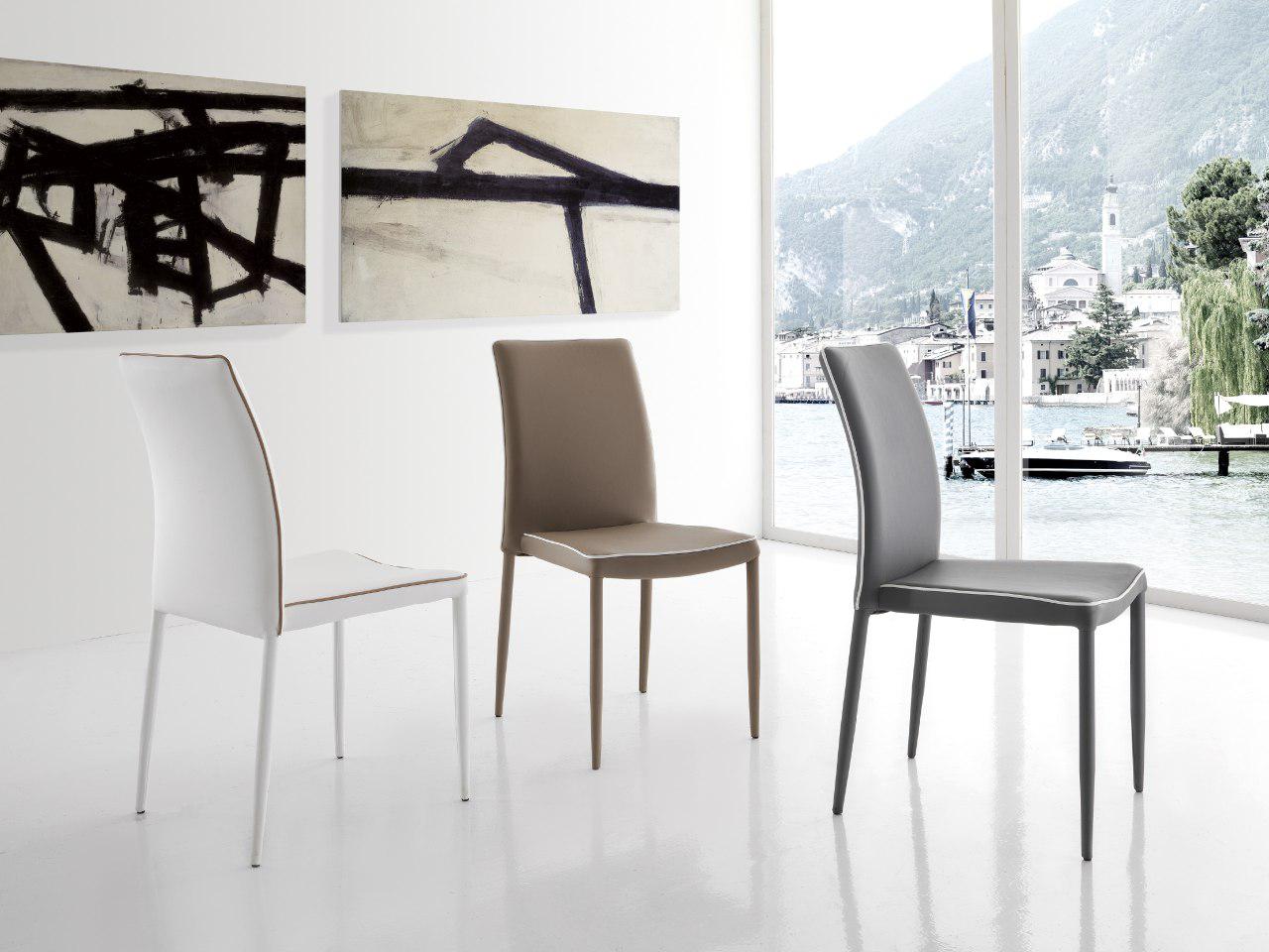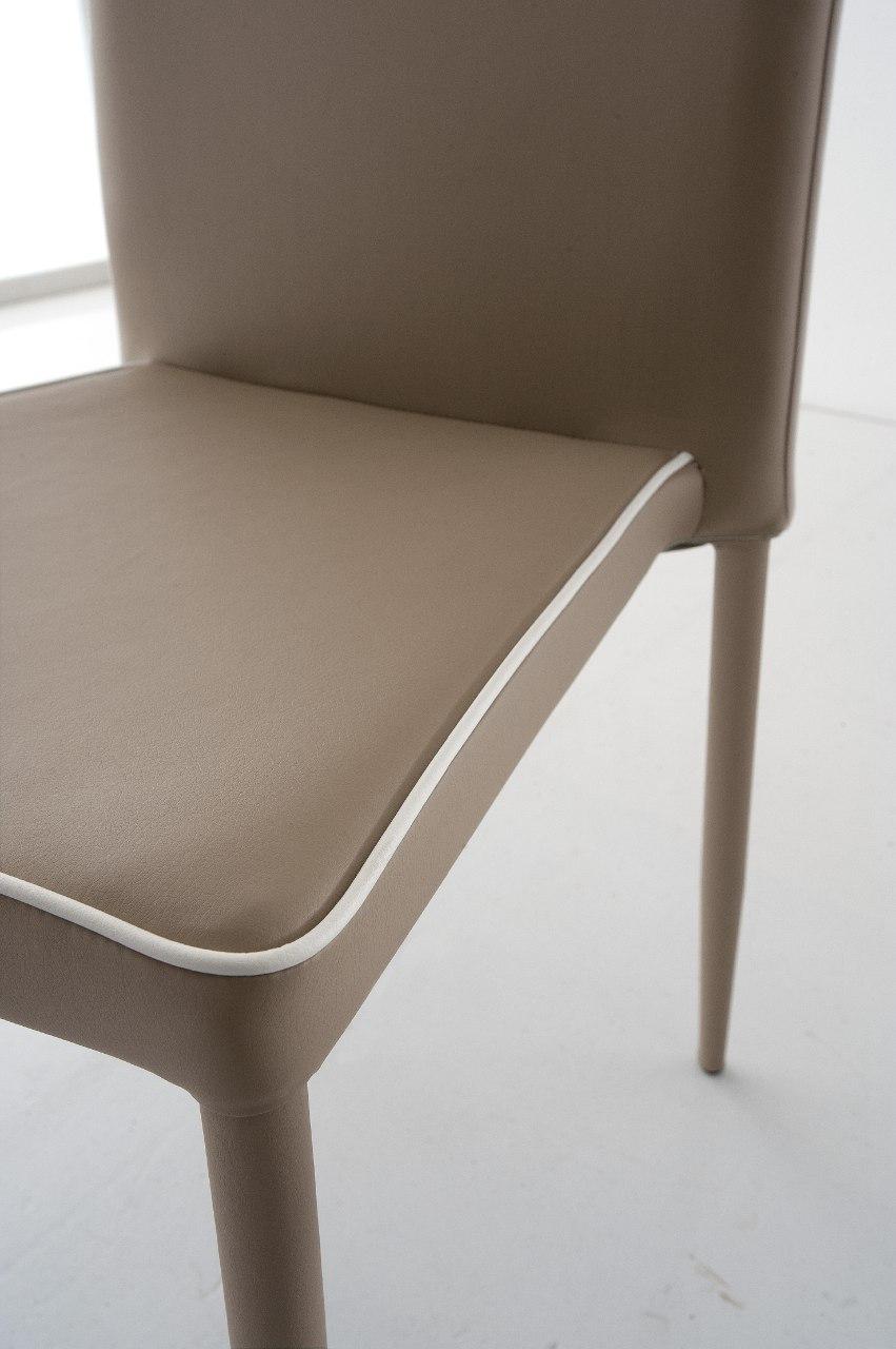 Sedia impilabile con gambi conificati e struttura in metallo, imbottitura in poliuretano espanso, rivestimento in Ecopelle (con bordino in contrasto in Ecopelle bianco), oppure in Econabuk Tortora , in Microfibra Vintage, o in Velluto.