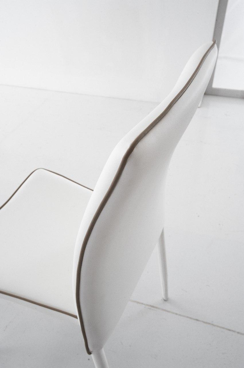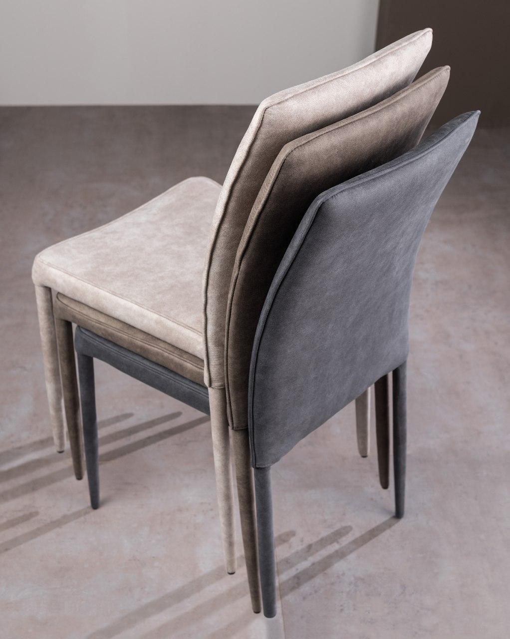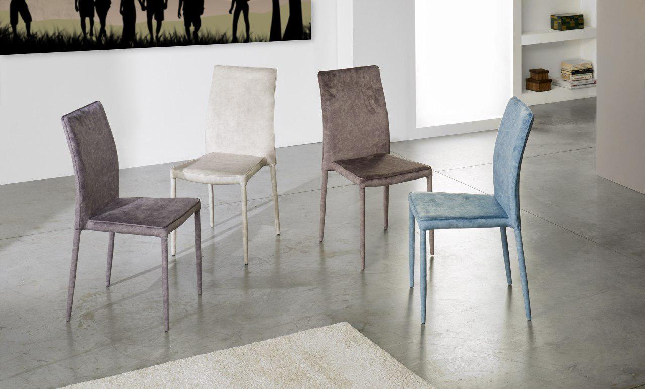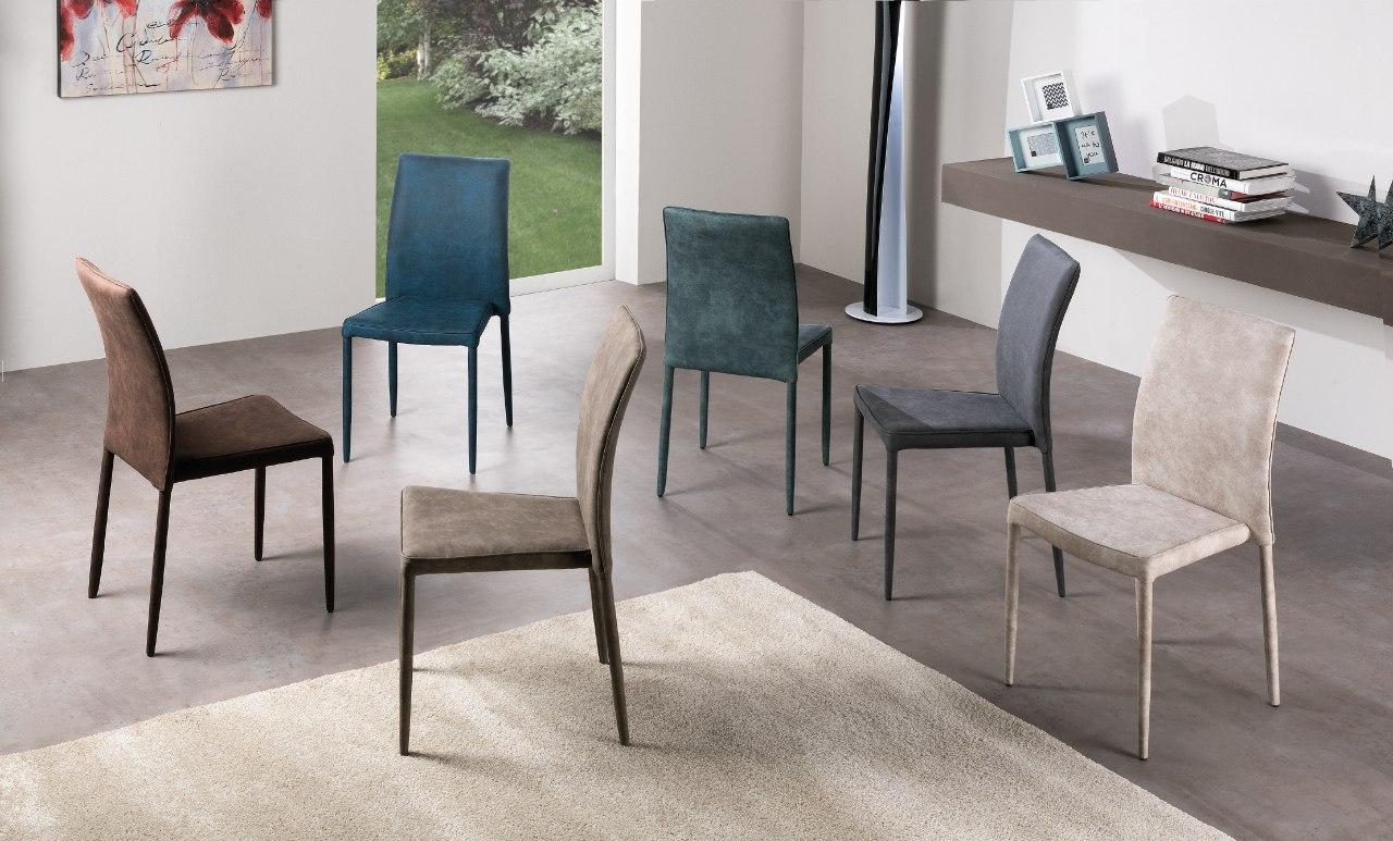 Sedia impilabile con gambi conificati e struttura in metallo, imbottitura in poliuretano espanso, rivestimento in Ecopelle (con bordino in contrasto in Ecopelle bianco), oppure in Econabuk Tortora , in Microfibra Vintage, o in Velluto.