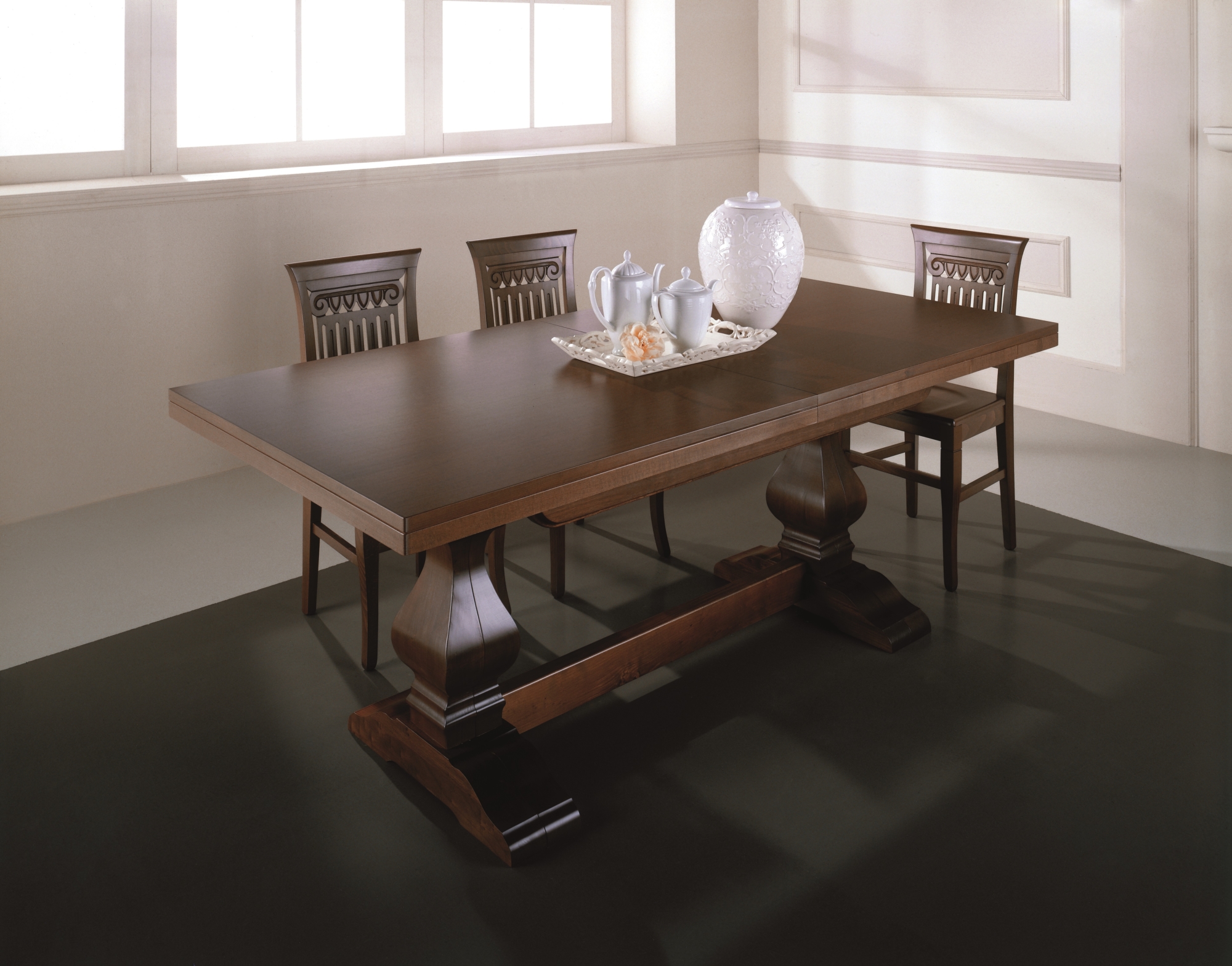 Tavolo allungabile al centro con struttura a basamento in legno massello di Tiglio, piano impiallacciato con bordo squadrato e sottocornice in massello spessore 60 mm, allunghe impiallacciate e bordate in massello da 55 cm cadauna contenute all’interno del tavolo.