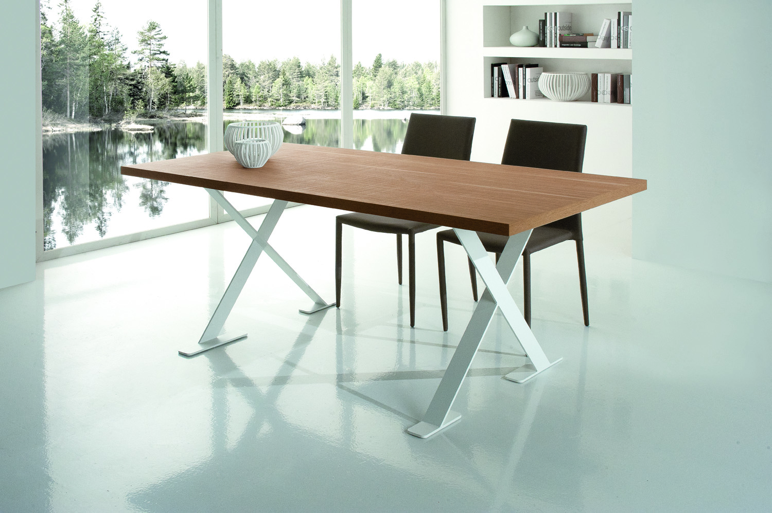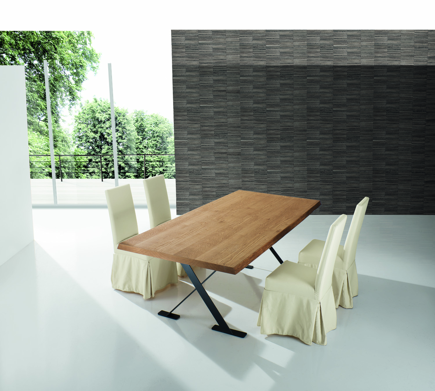Tavolo EXXTRA, basamenti in metallo verniciato a polvere epossidica, piano fisso (F) o allungabile (A) con due allunghe laterali ad inserimento a baionetta, disponibile in Laminato, Impiallacciato in frassino, in Rovere Nodato naturale (RND) e Rovere Spaccato (RSP) spessore 40 mm, oppure in tamburato Impiallacciato Rovere “Scortecciato” (RSC) disponibile solo fisso nella misura 100×220 cm e spessore 50 mm.