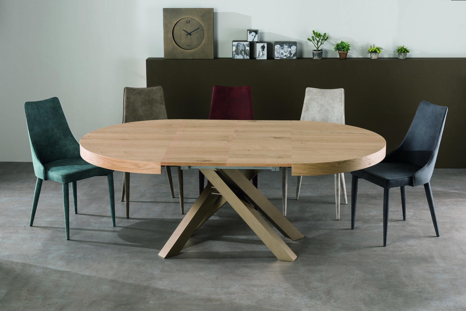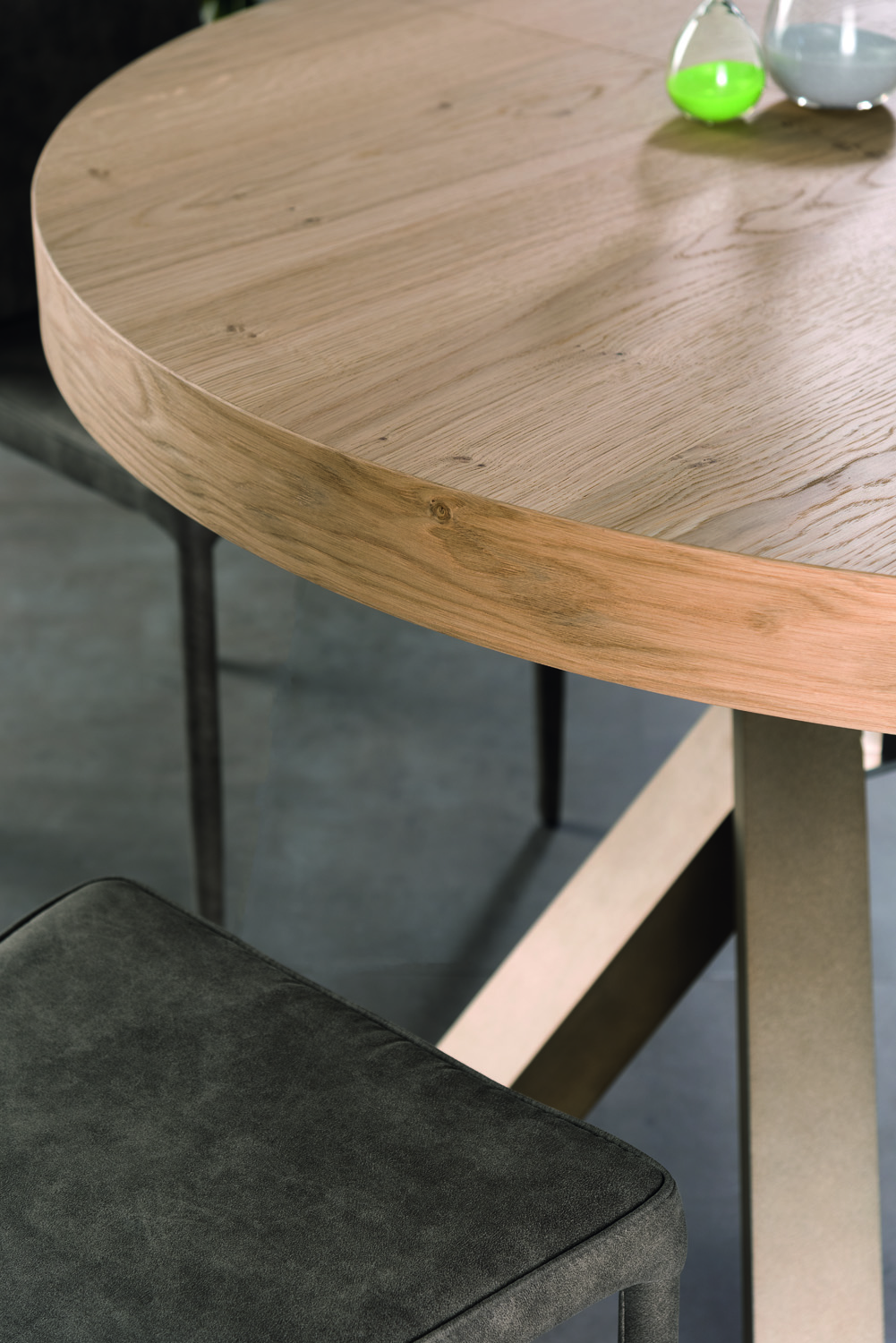 Tavolo allungabile al centro del piano, sistema di allungo sincronizzato interamente in alluminio anodizzato, semipiane con bordo in multistrato curvato e impiallacciato spessore 22 mm, altezza bordo 80 mm, disponibile impiallacciato in frassino e rovere nodato, allunghe tutte alloggiabili all’interno del tavolo, basamento interamente in alluminio anodizzato verniciato a polvere epossidica e smalti materici o lucidato Brill, sezione profili 80×80 mm, piedini regolabili.